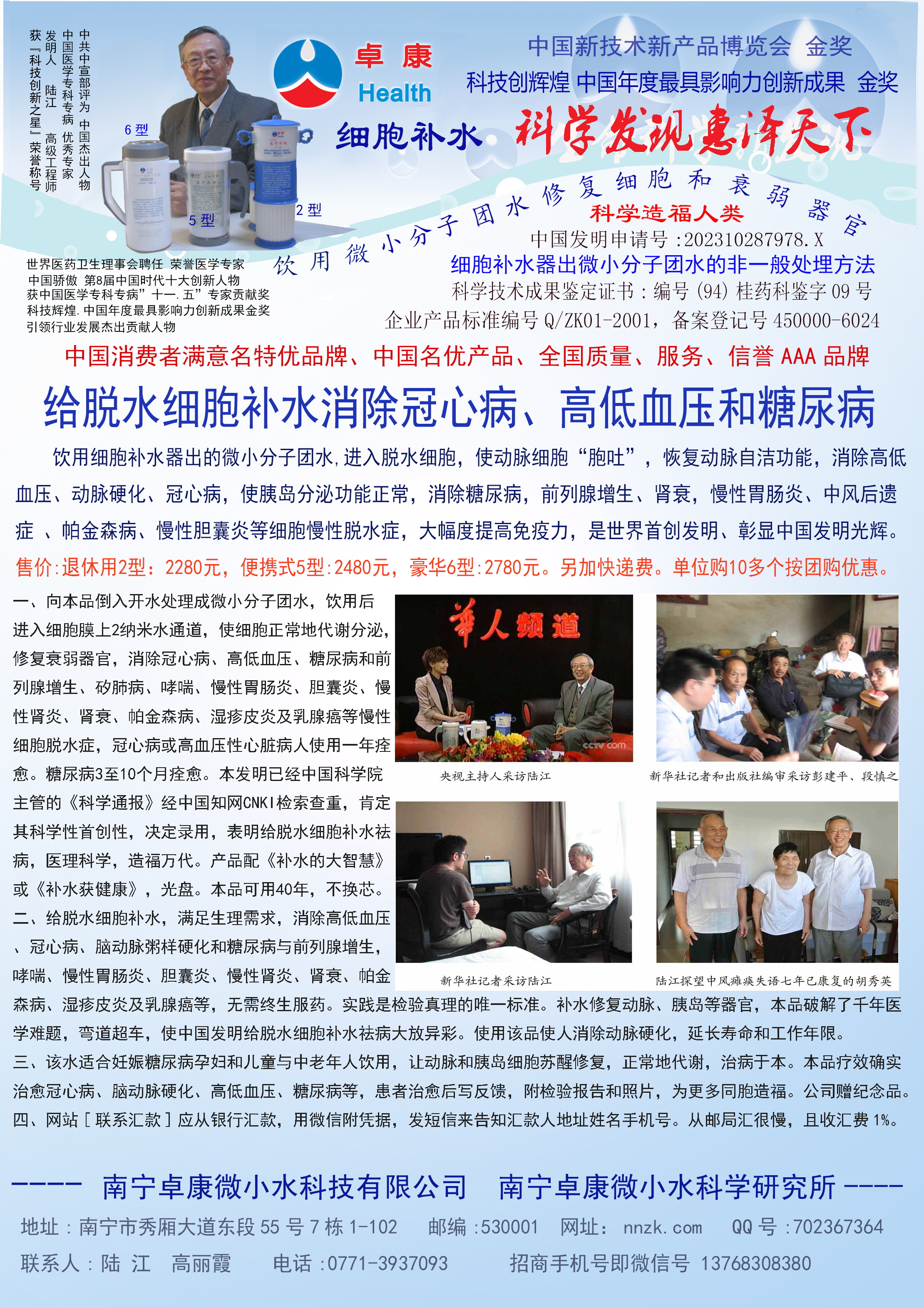 人類幾千年來(lái)患以上病癥需終生服藥,幾十年也不能治愈。可是我國(guó)南寧的高級(jí)工程師陸 江,于1990年想根治高血壓,研究發(fā)明了離子水瓶,處理出微小分子團(tuán)水供飲用,經(jīng)過(guò)醫(yī)院臨床試用和專家鑒定,1999年獲中國(guó)發(fā)明專利權(quán),產(chǎn)品于2000年投放市場(chǎng)后一直跟蹤調(diào)查,據(jù)全國(guó)各地用戶反饋:祛除了高低血壓、糖尿病和冠心病,并使前列腺增生、咽喉炎、鼻竇炎、慢性氣管炎、支氣管炎、矽肺病、哮喘、慢性胃炎、腸炎、慢性膽囊炎、慢性腎炎、腎衰、膀胱炎、便秘、痔瘡、風(fēng)濕性關(guān)節(jié)炎和濕疹皮炎及中風(fēng)后遺癥等病癥不藥而愈。為什么喝微小水能治20多種病?陸 江從1991年德國(guó)科學(xué)家發(fā)現(xiàn)細(xì)胞膜水通道僅為2納米獲得啟發(fā),認(rèn)為多種器官患病是因細(xì)胞脫水,不能正常代謝和分裂增殖,才使器官細(xì)胞減少致衰弱萎縮而形成細(xì)胞缺水性病癥。22年來(lái)的實(shí)踐有力地支持了“細(xì)胞脫水致病”這一重要論點(diǎn),表明喝微小水可滿足細(xì)胞的生理需求,補(bǔ)水就能祛病,是生命科學(xué)新亮點(diǎn)。