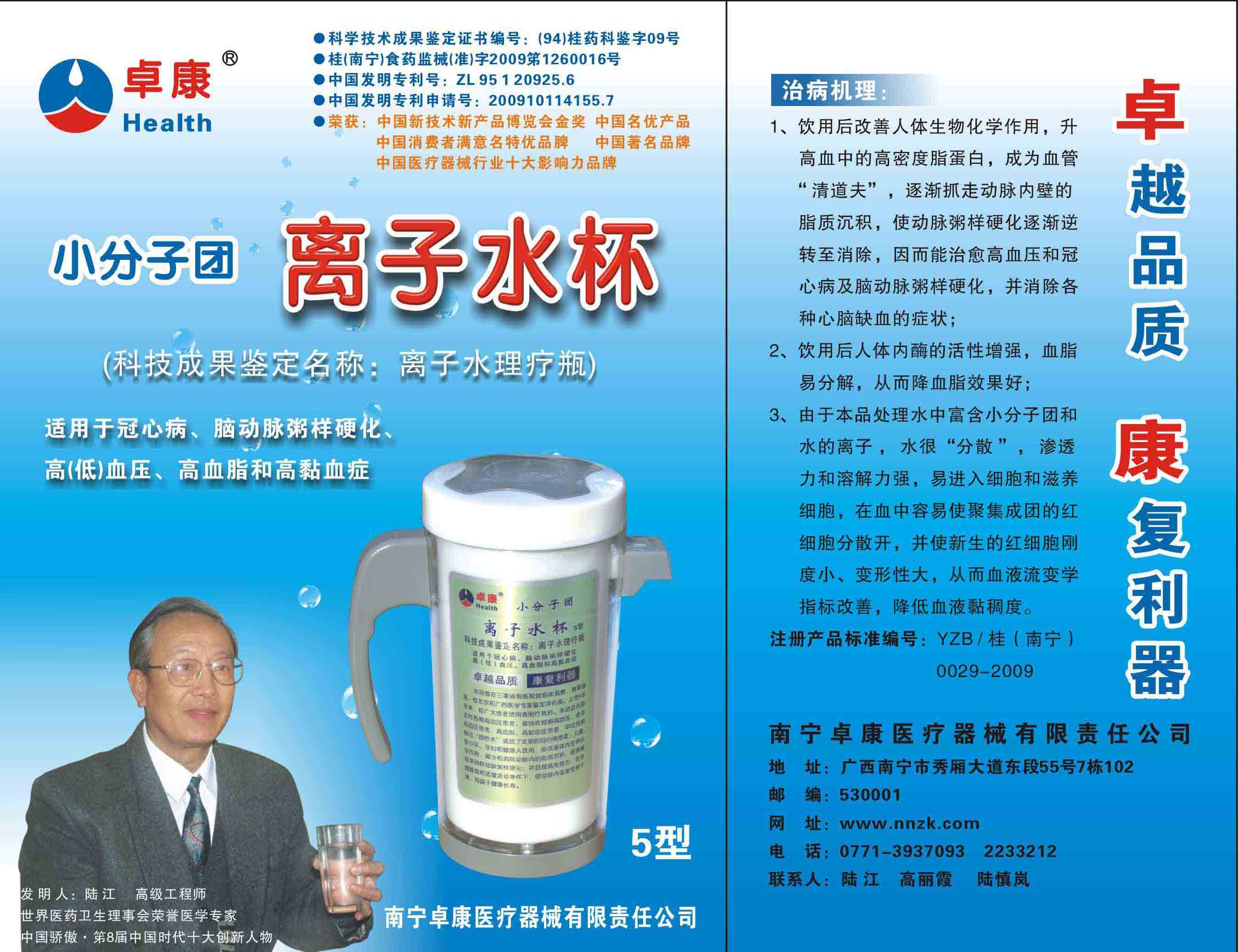 - -----南寧卓康微小水科技有限公司原為南寧卓康醫(yī)療器械有限責(zé)任公司 ,用戶普遍反饋高血壓患者飲用2—5個(gè)月,癥狀消除,不再服藥,治愈了高血壓; 冠心病患者,包括已做和未做支架或搭撟手術(shù)者,經(jīng)3—5個(gè)月飲用,消除心痛、胸悶、早搏、房顫和心絞痛等癥狀,逆轉(zhuǎn)至消除動(dòng)脈粥樣硬化和斑塊,一年左右治愈冠心病,心腦電圖正常,經(jīng)冠脈造影掃描無(wú)明顯狹窄,表明冠心病痊愈;糖尿病人飲用3-10個(gè)月,血糖尿糖正常,治愈2型糖尿病; 并且使前列腺增生、低血壓、腦萎慢性咽喉炎、慢性氣管炎、支氣管炎、哮喘、矽肺病、甲亢、慢性胃腸炎、膽囊炎、慢性腎炎、腎衰、風(fēng)濕性關(guān)節(jié)炎、痔瘡和濕疹皮炎及中風(fēng)癱瘓或偏癱失語(yǔ)后遺癥等不藥而愈,且多病同治,無(wú)需終生服藥,彌補(bǔ)了幾千年來(lái)藥物的欠缺,使“微小水”成為人類消除高血壓、冠心病和糖尿病的寶貴資源。腦動(dòng)脈粥樣硬化、低血壓和前列腺增生患者,一般飲用四個(gè)月痊愈;中風(fēng)后遺癥患者,一般飲用8個(gè)月痊愈。請(qǐng)?jiān)旈啞队脩舴答仭窓谀恐写罅炕颊叩姆答佇拧z測(cè)報(bào)告,有的還附照片。產(chǎn)品屢獲大獎(jiǎng),論文也屢獲一等獎(jiǎng)。廣大用戶好評(píng)不斷,有口皆碑。
